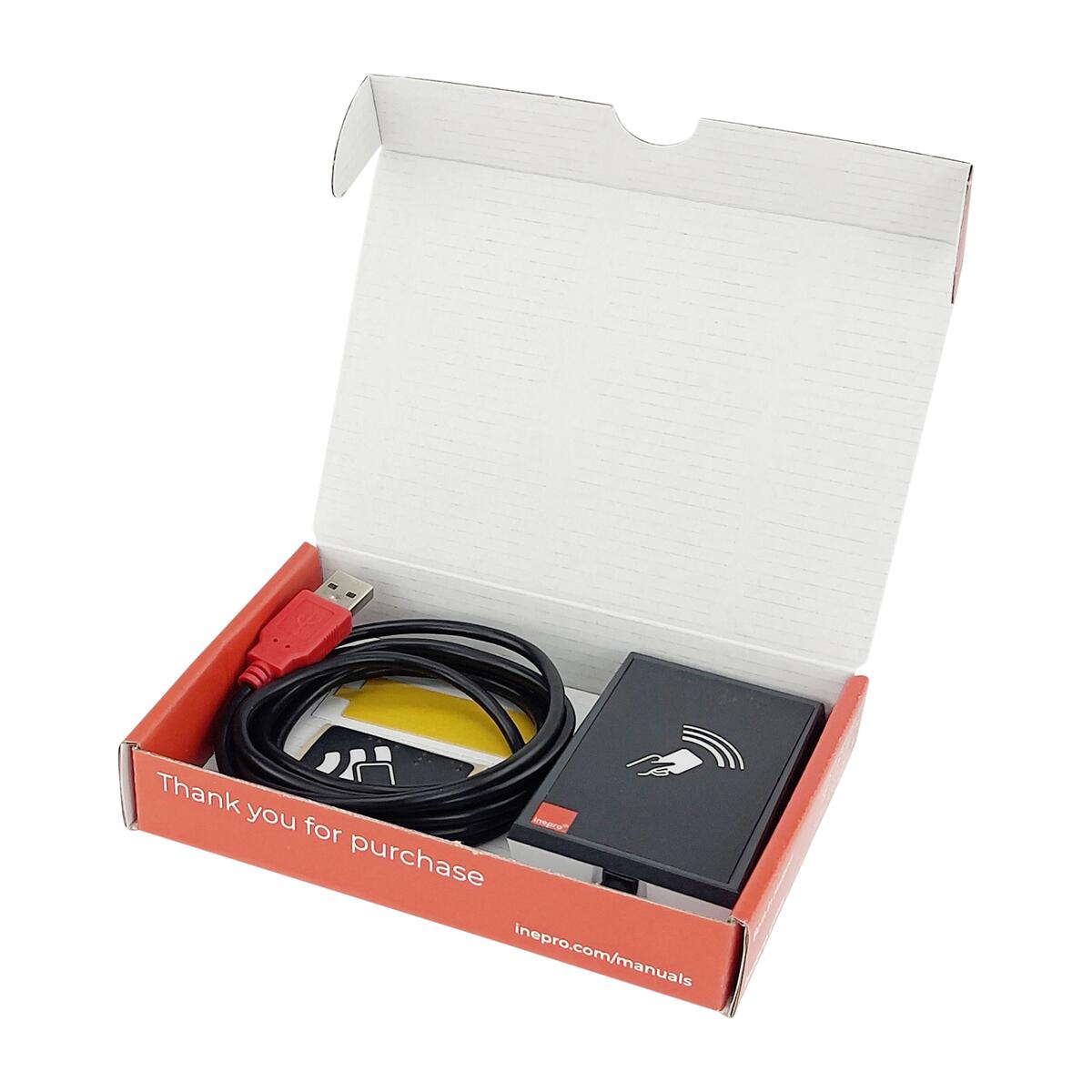 Inepro Red Spider HF only Desktop MFP Complete 180cm USB-A Male, card reader EXTERN, RFID reader pentru frecvente HF (13,56kHz), NFC si BLE (2,4GHz), antena integrata pe PCB, alimentare 4.3-5.5V pe conector pico blade, consum 150mA-280mA maxim, distanta read/write 100mm, moduri de operare: USB keyboard emulation, USB virtual COM port, USB RAW, RS232, bluetooth v5.3, standards as GAP, SM, L2CAP, ATT, predefined GATT structure; AES128 supported, viteza de transmisie: USB Full speed (12Mbit/s), HF Air: up to 848 kbit/s, BT Air: up to 100 kbit/s. Dimensiuni 62,3x41,3x12,5 mm, greutate 23g. Se livreaza cititor (placa electronica), carcasa, cablu USB-A male 180cm, sticker. Mobile app pentru (re)configurare, si pentru autentificare user cu NFC/BLE. Compatibil cu solutiile de management: YSoft (EOP, SafeQ), Optimidoc, Papercut, MyQ, Geniusbytes, LRS, MSE, NT-ware (UniFLOW), Kofax (Equitrax, Printix, SafeCom), Ricoh (CAP, CloudStream, myPrint, Streamline NX), Ximedes (DocuPRO, Kuario). 5 ani garantie.