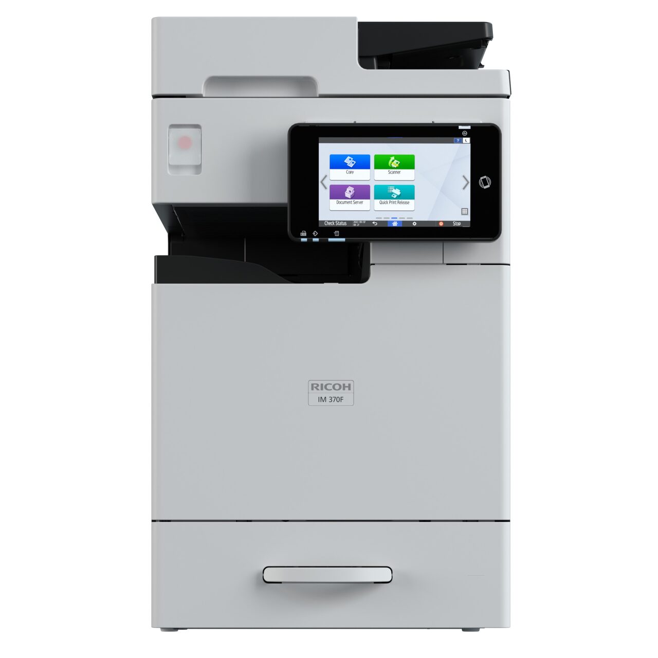 Ricoh IM370, multifunctional A4 mono (+A3), 37ppm, 28ppm in duplex, copy/print/scan, single pass SPDF (DADF) 50 coli, rezolutie print 1200x1200dpi, copy 600x600dpi, PCL5 si 6/PS3/PDF, fpo 3,8s, fco 4,7s, procesor 1,2GHz, memorie 6GB + 64GB eMMC (opt 256GB SSD, 320GB HDD), alim 100+500 coli (max 2100), iesire 250 coli, paper 52-216gsm, duty 150k/luna, recomandat 10000p/luna, USB/Ethernet Gigabit/Bluetooth (opt WiFi), touch screen 7", TEC value 0.38 kWh/week, scan speed 46ipm/92ipm duplex, scan to E-mail, Folder, USB, URL, FTP, scan format TIFF, PDF, PDF/A, High Compression PDF, encrypted PDF, opt Searchable PDF (OCR Option required), warm up 31s, consumabile: toner 842610 (13.5k), cilindru D0DM0124 (160k), dimensiuni 37,4x49,3x64 cm, greutate 41kg, garantie 12 luni, on depot. FARA toner.