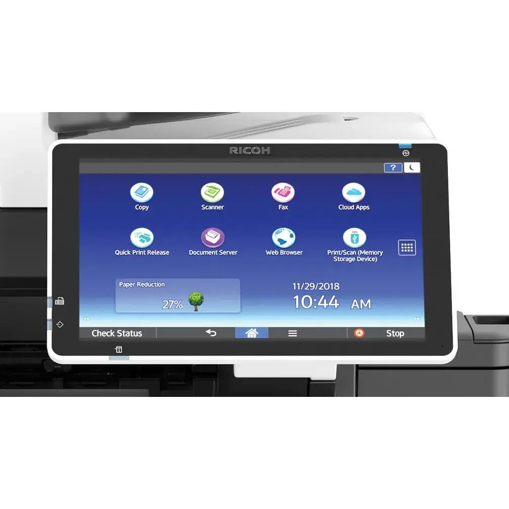 Ricoh IM430FSE, multifunctional A4 mono, 43ppm, 37ppm in duplex, copy/print/scan/fax, single pass SPDF (DADF) 50 coli, rezolutie print 1200x1200dpi, copy 600x600dpi, PCL5 si 6/PS3/PDF, fpo 5,4s, fco 7s, procesor 1,46GHz, memorie 4GB + 320GB HDD, alim 100+500 coli (max 2100), iesire 250 coli, paper 52-256gsm, duty 70k/luna, recomandat 3000p/luna, USB/Ethernet Gigabit (opt WiFi), touch screen 10.1", TEC value 0.59 kWh/week, scan speed 43.4ipm/80ipm duplex, scan to E-mail, Folder, USB, scan format TIFF, JPEG, PDF, PDF/A, High Compression PDF, opt Searchable PDF (OCR Option required), warm up 22s, consumabile: toner 419082 (14k), cilindru D0A42035 (70k), dimensiuni 47.6x44.2x51 cm, greutate 30.5kg, garantie 12 luni, on depot. Cu toner.