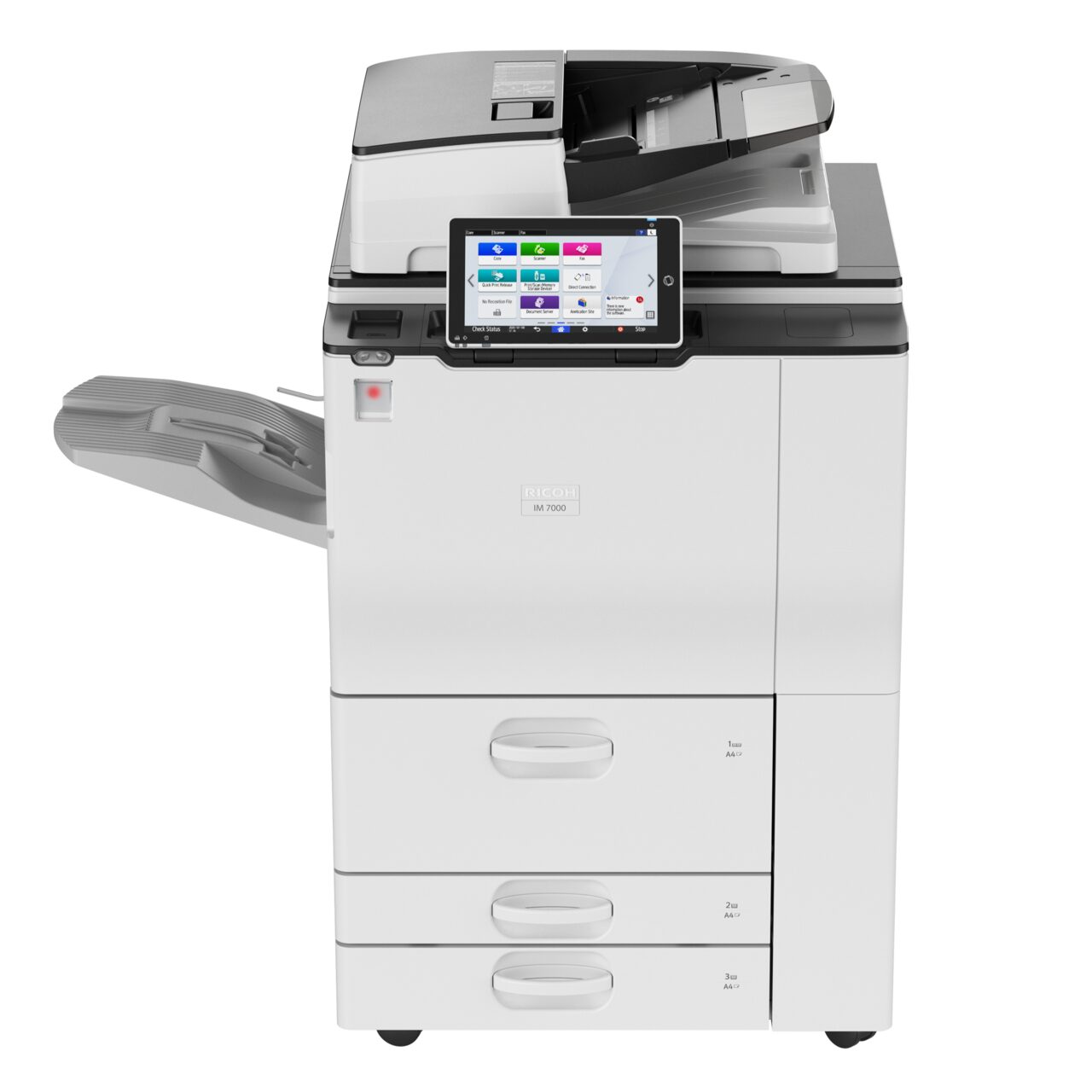 Ricoh IM8000, multifunctional A3 mono, 80ppm A4, 40ppm A3, 80ppm A4 in duplex, copy/print/scan, single pass SPDF (DADF) 220 coli, rezolutie print 1200x1200dpi, copy 600x600dpi, PCL5 si 6/PS3/PDF, fpo 4,7s, fco 3,2s, procesor 1.6GHz, memorie 2GB+320GB HDD, alim 100+2x550+2x1550 coli (max 8700), iesire 500 coli (max 3500), paper 52-300gsm, duty 300k/luna, recomandat 29000p/luna, USB/Ethernet Gigabit/Bluetooth/SD slot/NFC/WiFi, port USB frontal, touch screen 10.1", TEC value 1.696 kWh/week, scan speed 120ipm/240ipm duplex, scan to E-mail, Folder, USB, SD Card, URL, FTP, SMB, scan format TIFF, JPEG, PDF, PDF/A, high compression PDF, warm up 20s, consumabile: toner 842346 (43k), cilindru B2469510 (1200k), developer B0649640 (300k), dimensiuni: 69x88,3x1,161 cm, greutate 200kg, garantie 12 luni, on site. FARA toner. INSTALARE GRATUITA.