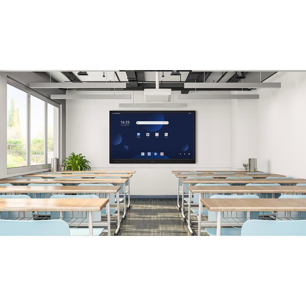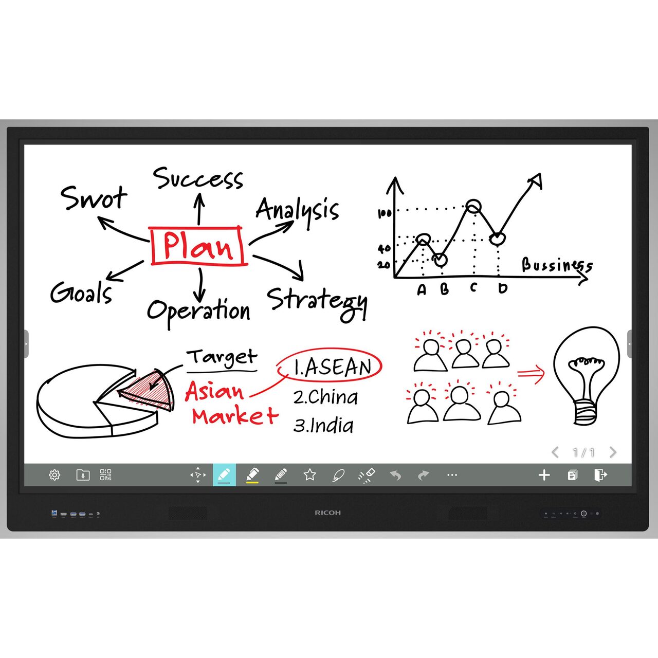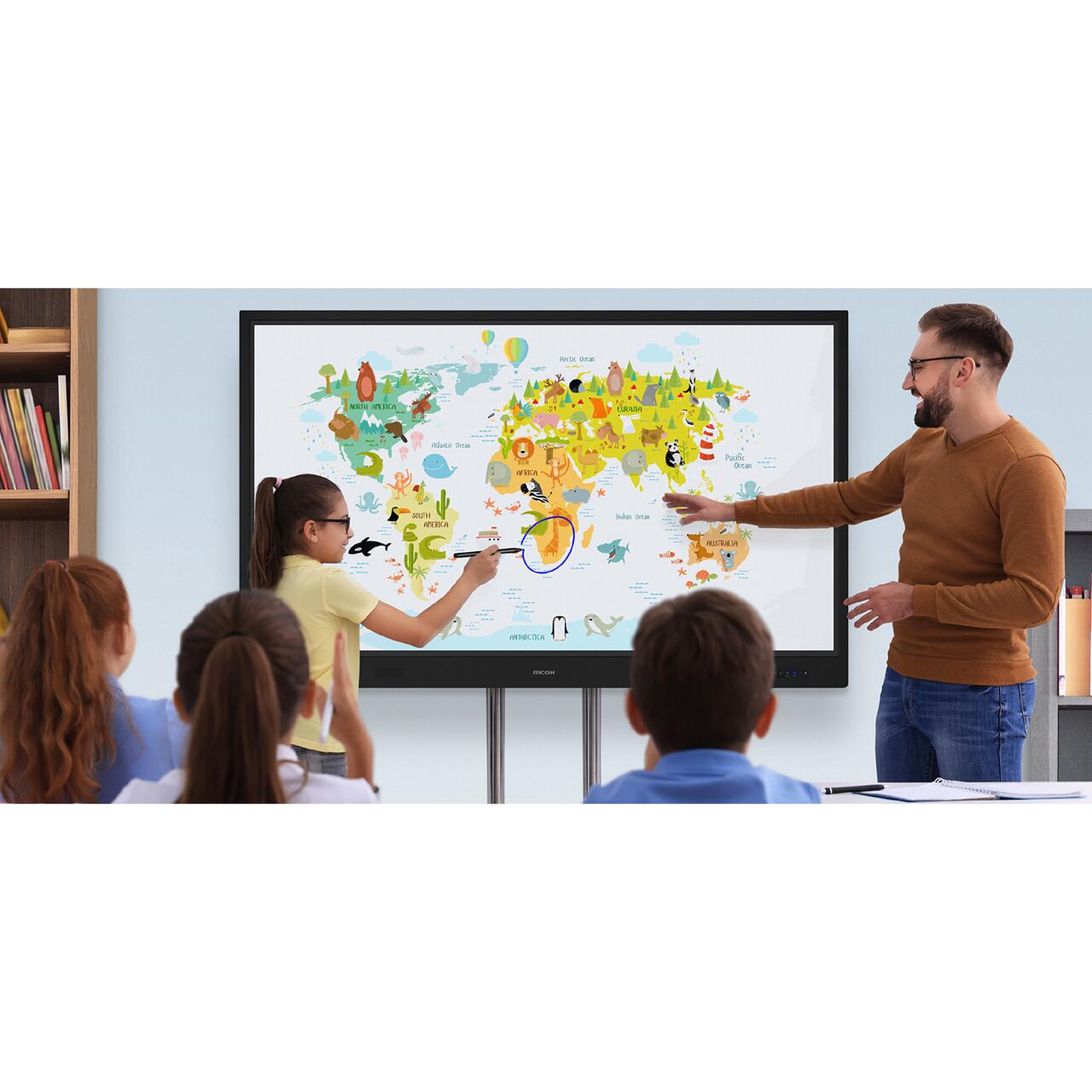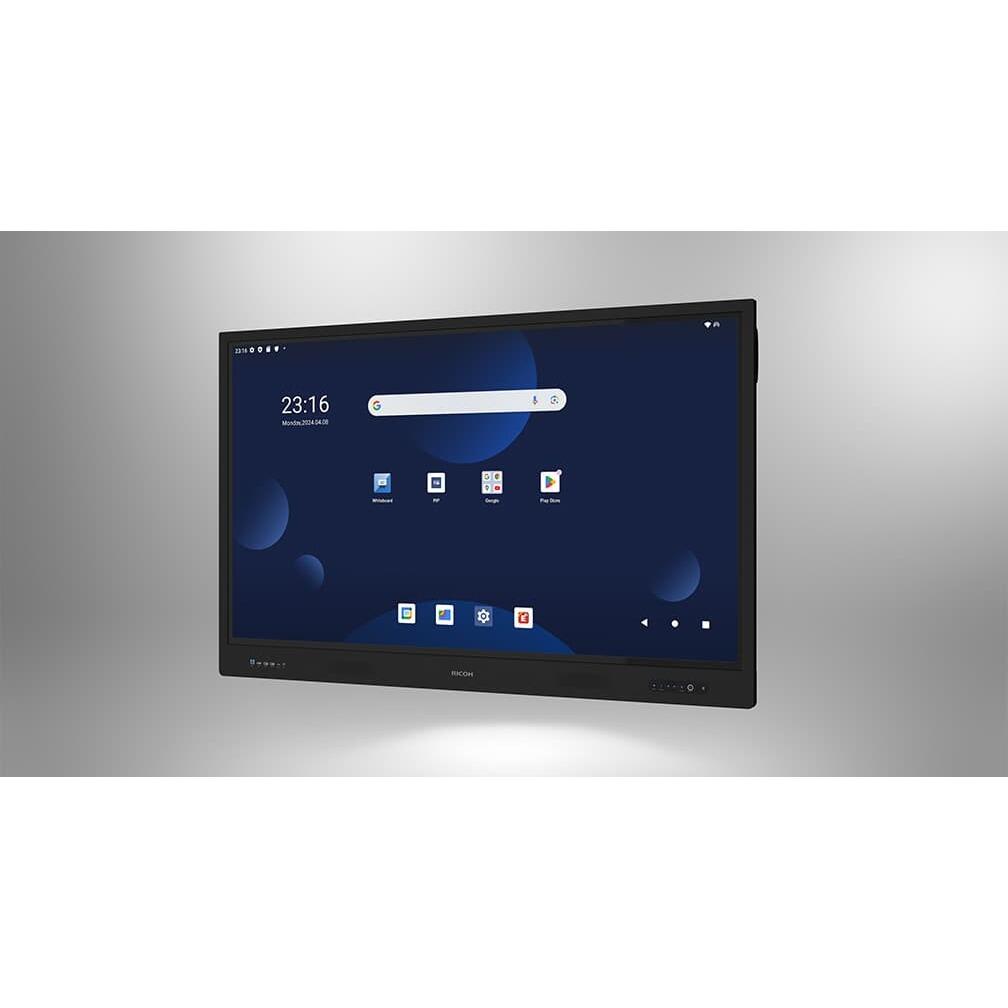 Ricoh Interactive WhiteBoard IWB A8610 - display 86" (216cm), 4K UHD, landscape 16:9, memorie RAM 8GB, stocare ROM 128GB, ecran disponibil efectiv 1895 x 1625mm, rezolutie 3,840 x 2,160 pixeli, rezolutie interpolata 32768x32768, brightness 400cd/mp, contrast 4000 : 1, pixeli 0.4935 x 0.4935mm, colors 1,070,000,000, timp de raspuns 8ms, refreshing frequency 60Hz, view angle 178/178, LED lifetime 50000h, accuracy/precizie 1mm, functionare 18h/zi, OPS slot, senzor lumina, NO motion detection sensor, NO dust resistant, rear interface: USB A x 3, USB C x 1, USB B x 3, HDMI In x 2, DisplayPort x 1, OPS Slot x 1, RS232 x 1, Audio Out x 1, Line out or Headphone x 1, SPDIF x 1, HDMI Out x 1, LAN 1000Base-T x 2, front interface: HDMI x 1, USB C x 1, USB A 3.0 x 2, USB B 3.0 x 1, MIC In x 1, conectivitate wired LAN/WiFi 5,6/Bluetooth 5.2, multi touch in Windows/Android, single touch Linux/Chrome, grosime protection glass cu AR coating 3,2mm, sticla securizata anti-glare AG, anti-fingerprint AF, hardness 8H, up to 40 touch points, Wireless screen sharing, rama frontala aluminiu/ spate metal, culoare negru. Consum standard 200W, ECO mode 168W, cu OPS 520W, stand by 0,5W, audio 2 x 15W, 8 OHMI, Android 13 EDLA, aplicatii preinstalate: Whiteboard, Picture-In-Picture, Eshare, Browser, Settings, Google Play Store, Google Calender, Files by Google, Search, Chrome, Gmail, Maps, YouTube, Drive, YT Music, Google TV, Meet, Photos. Energy Star certified. Accesorii incluse: 2 x touch PEN, telecomanda, cablu alimentare, USB type C (2m), HDMI 2.0 (3m), USB A-B 3.0 (3m), plastic clamps 3+3buc, 2 x baterie AAA. Prindere VESA 4buc x - M8 screw hole 800 x 400 mm. Dimensiuni 1,981 x 92 x 1,217mm, greutate 65kg, FARA suport de perete sau stand mobil.