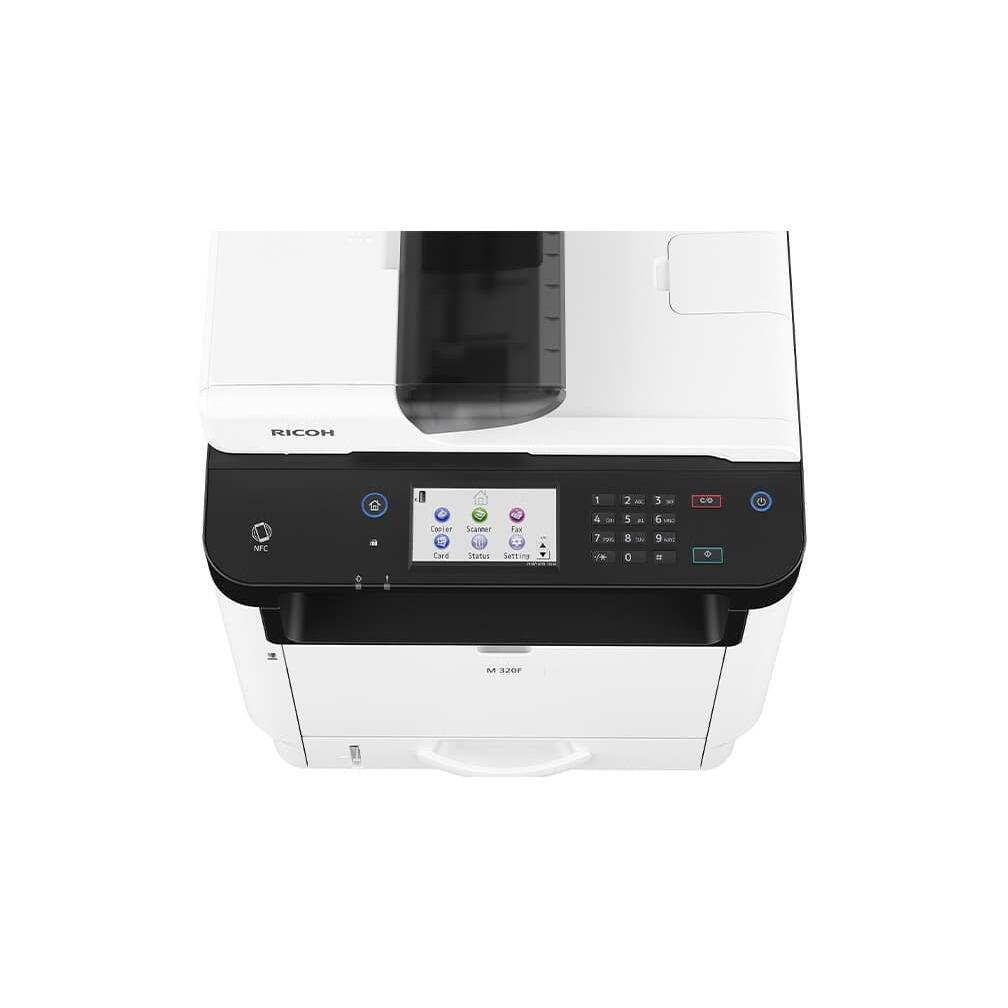 Ricoh M320, multifunctional A4 mono, 32ppm, 13ppm in duplex, copy/print/scan, ADF 35 coli, rezolutie print-copy 1200x1200dpi, PCL5 si 6/PS3, fpo 7,1s, procesor 400MHz, memorie 256MB, alim 50+250 coli (max 550), iesire 50 coli, paper 52-162gsm, duty 35k/luna, recomandat 5833p/luna, USB/Ethernet (opt WiFi), toner start 1000p, warm up 26s, LCD-4 line screen, TEC value 0.87 kWh/week, scan speed 11ipm mono - 4,5ipm color, scan to E-mail, folder, FTP, USB, scan format TIFF, JPEG, PDF, PDF/A, warm up 30s, consumabile: toner 408278 (3,5k), toner 408281 (7k), dimensiuni 40,5x39,2x42 cm, greutate 18kg, garantie 12 luni, on depot.
