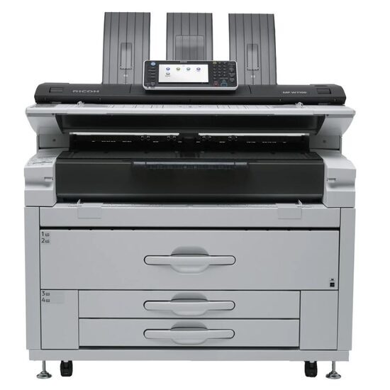 Ricoh MPW7100SP, multifunctional A0 mono, 120mm/s or 5ppm A0 - 10ppm A1, copy/print/scan color + cutter, rez 600dpi, PS/XLS/PDF/HP-GL, fpo 9s A1, procesor 1.06GHz, memorie 2GB+2GB+320GB HDD, alim bypass 1 coala + 2 roll papers (opt 2 role sau 2x250 sheet tava), latime 210-914.4mm, diametru 175mm, lungime maxima 914-15000mm, formate A0/A1/A2/A3/A4, grosime 51-134gsm, USB/Ethernet (opt WiFi), port USB frontal, touch screen 9" tiltable, scan speed color 200mm/s - mono 340mm/s, scan to E-mail/USB/document server/network location, warm up 120s, duty 16620m or 11k A1/luna, recomandat 1200m/luna or 2k A1/luna, machine life 1.683.000 copii, toner 821021 (2,2k), developer B1259640 (50k), drum D2069510 (50k), dimensiuni 1250x755x1193mm, greutate 245kg, garantie 12 luni, on site. INSTALARE GRATUITA. Tonere si developere incluse. (2 of each)