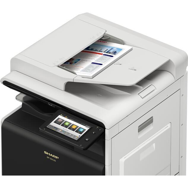 Sharp BP30C25, multifunctional A3W color, 25ppm A4, 14ppm A3, 25ppm A4 in duplex, copy/print/scan, RSPF (DADF) 100 coli, rezolutie print 600x600dpi / 9600x600dpi, copy 600x600dpi, PCL6 (opt PS3), fpo/fco 11s color - 8s mono, procesor quad core 1,4GHz, memorie 5GB, SSD 128GB, alim 100+250 coli (max 1850), iesire 250 coli, paper 55-256gsm, duty 84k mono - 36k color/luna, recomandat 2100p mono - 900p color/luna, USB/Ethernet Gigabit (opt WiFi/NFC), touch screen 7", TEC value 1.2 kWh/week, scan speed 52ppm/20ipm duplex, scan to E-mail, FTP, Shared folder (SMB), Local Drive, USB, opt Desktop, Fax, scan format TIFF, PDF, Encrypted PDF, JPEG, XPS, opt Compact PDF, Searchable PDF, OOXML(pptx, xlsx, docx), TXT, RTF, warm up 18s, toner lock (blocare scoatere), serverless follow-me print, two LAN support, consumabile: toner black BPGT30BB (10k), BPGT30BA (20k), cyan BPGT30CB (7.5k), BPGT30CA(15k), magenta BPGT30MB(7.5k), BPGT30MA(15k), yellow BPGT30YB(7.5k), BPGT30YA(15k), drum BPDR20SA (120k), developer black BPGV20BA (120k), color BPGV20SA (120k), waste BPHB200 (30k), dimensiuni 57 x 63 x 65,3 cm, greutate 54kg, garantie 12 luni, on site.