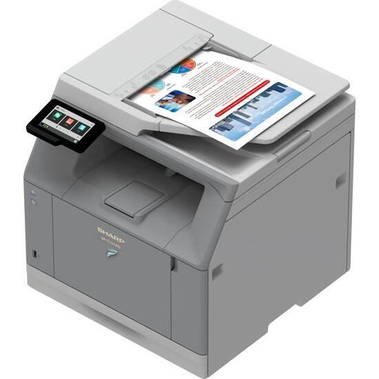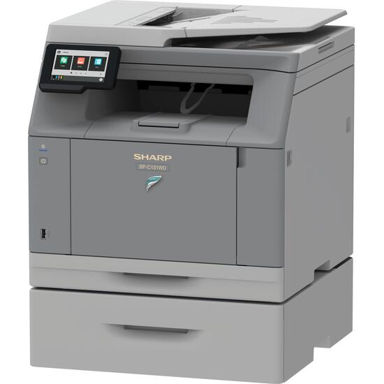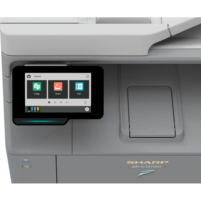 Sharp BPC131WD, multifunctional A4 color, 31ppm, 17ppm in duplex, copy/print/scan/fax, single pass DSPF (DADF) 50 coli, rezolutie 600x600dpi, PCL6/PS3, fpo 8.5s color - 6.5s mono, fco 7.2s color - 6s mono, procesor dual core 833MHz, memorie 2GB+16 eMMC, alim 50+250 coli (max 800p), iesire 150 coli, paper 60-200gsm, duty 50k/luna, recomandat 700p/luna, toner start 1000p black, 1000p color, USB/Ethernet Gigabit/WiFi, touch screen 4", TEC value 0.32 kWh/week, scan speed 30ppm mono - 20ppm color/60ipm mono - 40ipm color duplex, scan to E-mail, FTP, SMB, USB, Fax, scan format TTIFF, PDF, JPEG, warm up 33s, consumabile: toner black BPC10GTBA (6k), cyan BPC10GTCA (5k), magenta BPC10GTMA (5k), yellow BPC10GTYA (5k), drum unit KCMY BPC10DD (50k), waste BPHB101 (13.5k), dimensiuni 41 x 41 x 39,9 cm, greutate 22kg, garantie 12 luni, on depot.