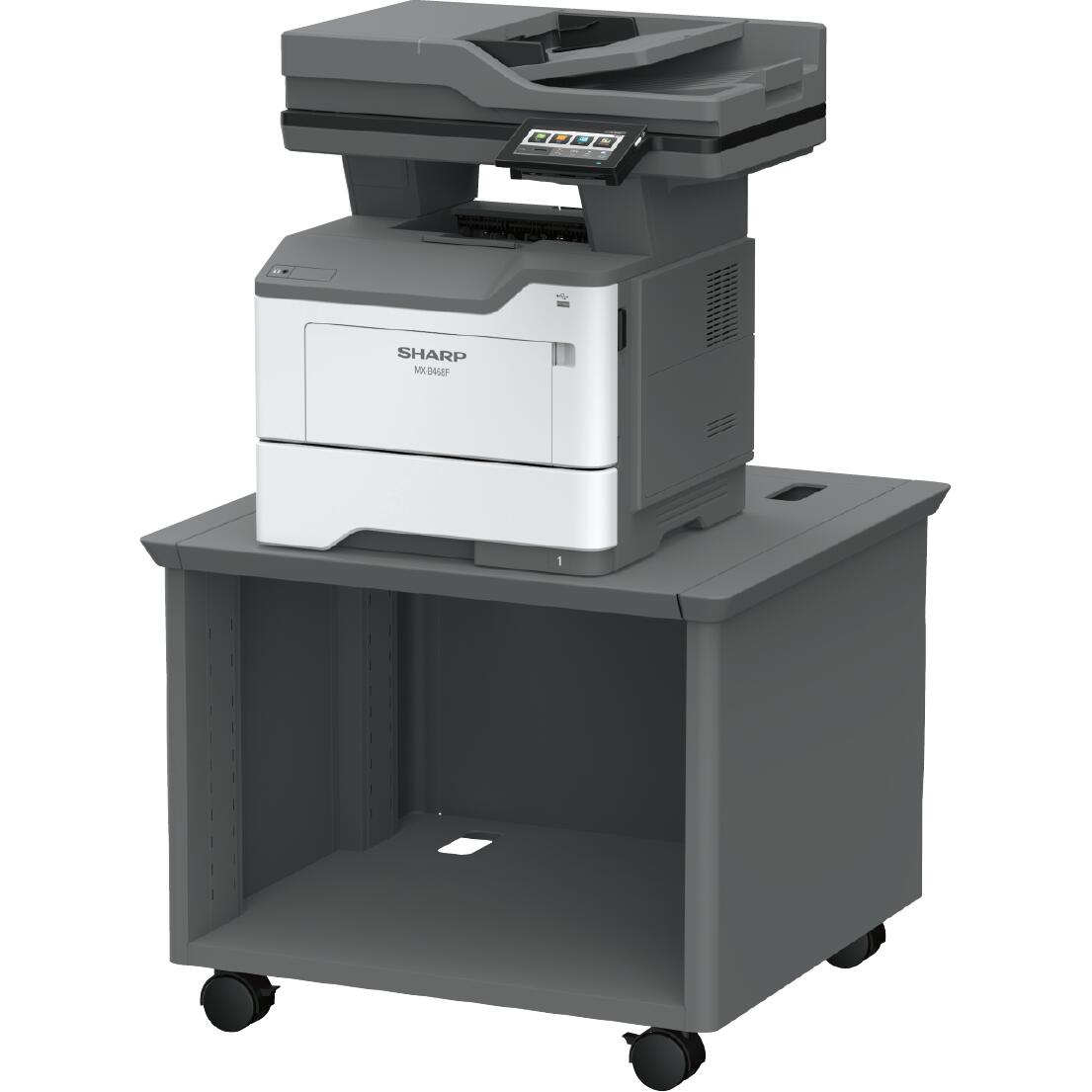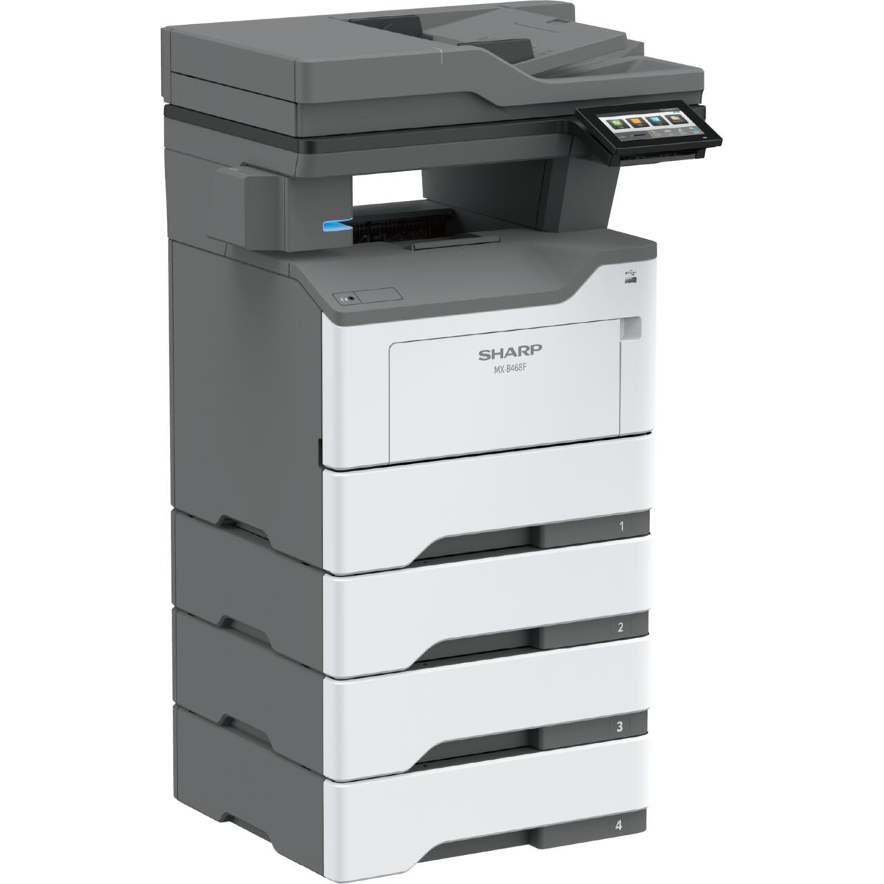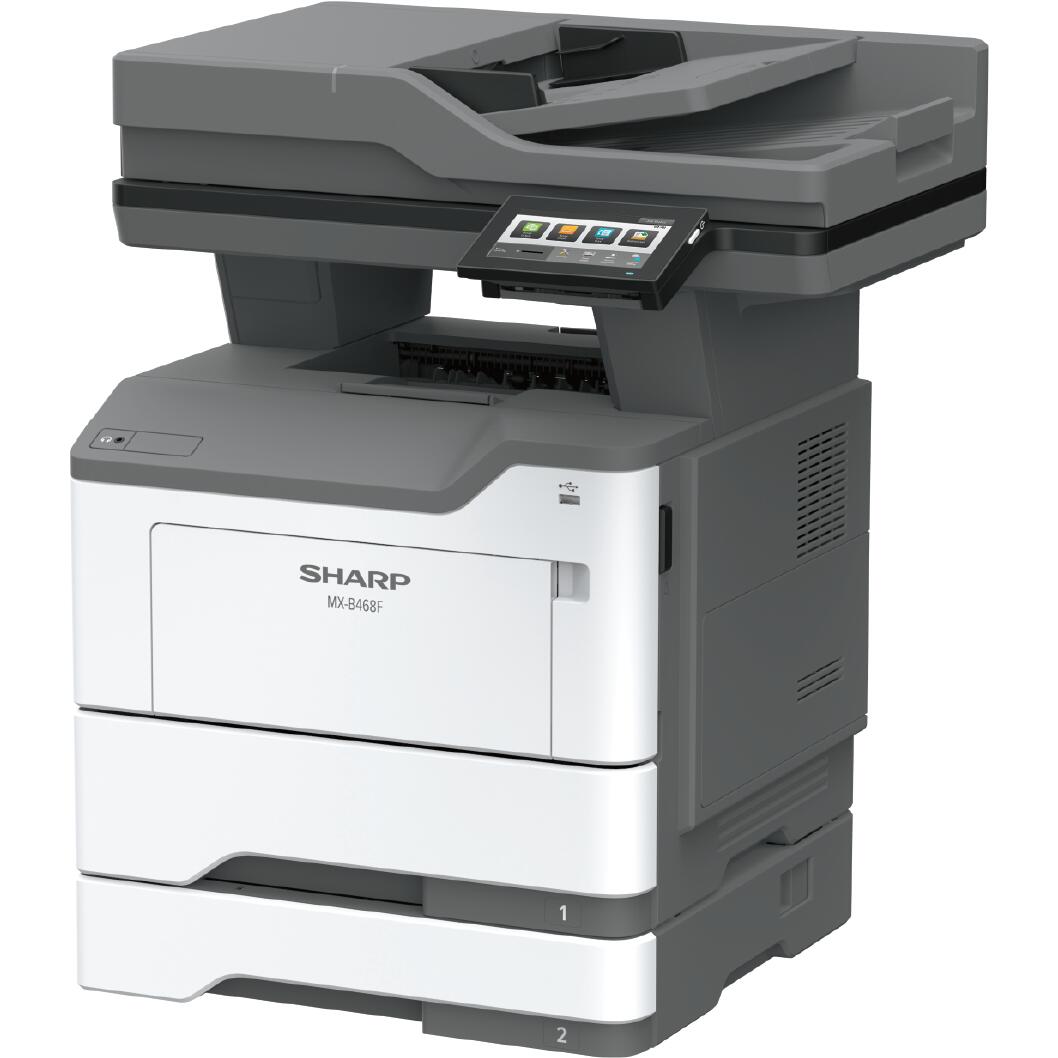 Sharp MXB468F, multifunctional A4 mono, 44ppm, 23ppm in duplex, copy/print/scan/fax, single pass DSPF (DADF) 100 coli, rezolutie print 1200x1200dpi, copy 600x600dpi, PCL5/6/PS3, fpo/fco 6s, procesor quad core 1,2GHz, memorie 2GB (opt SSD 128GB or HDD 500GB), alim 100+550 coli (max 2300), iesire 250 coli, paper 60-216gsm, duty 120k/luna, recomandat 15000p/luna, toner start 5000p, USB/Ethernet Gigabit (opt WiFi), touch screen 4.3", TEC value 0.55 kWh/week, standard Cloud/OSA (integrare aplicatii externe), mobile print, scan speed 49ppm mono, 34ppm color/98ipm mono, 68 ipm color duplex, scan to E-mail, FTP, Shared folder (SMB), USB, opt HDD, Fax, scan format TIFF, PDF, Encrypted PDF, XPS, Compact PDF, JPEG, opt Searchable PDF, DOCX, CSV, TXT, RTF, XLSX, warm up 65s, consumabile toner MXB47T (31k), cilindru MXB47DU (75k), dimensiuni 47,9 x 45 x 51,4 cm, greutate 21kg, garantie 12 luni, on depot.